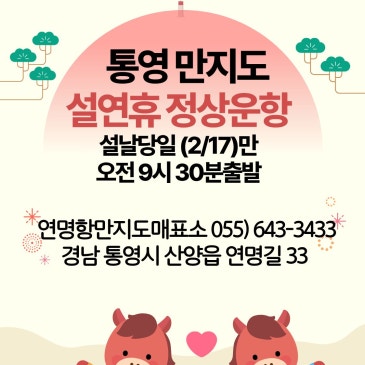 설 연휴, 마음이 가장 분주한 때죠. 그럴수록 바다와 숲이 함께 위로해 주는 섬이 정답입니다. 통영 만지도·연대도는 배로 15분이면 닿고, 출렁다리로 섬 두 곳을 한 번에 즐길 수 있어 “먹고·쉬고·걷는” 진짜 섬여행을 완성시켜 줍니다. 이번 연휴 운영 시간, 배편, 인기 코스, 1박3식 팁까지 한 장에 정리했습니다. 1. 설 연휴 운항 정보(핵심만 쏙) 정상 운항: 설 연휴 기간 전반은 평상시와 동일하게 운항합니다. 설 당일(2월 17일)만 변동: 첫배가 오전 9:30 출항(평소 대비 1시간 늦게). 그 외 날짜: 첫배 오전 8:30, 오후 4:00까지 운항. 간격: 평일(연휴 평일 포함) 1시간 간격, 주말·공휴일 30분 간격. 승선 팁: 예약 없이도 회전이 빨.......